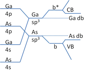 Compound semiconductors, such as GaAs, have dangling bond states that are nearer to the band edges (see Figure 2). As bonding becomes increasingly more ionic, these states can even act as dopants. This is the cause of the well known difficulty of GaN p-type doping where N vacancies are abundant due to its high vapor pressure resulting in high Ga dangling bond density. These states are close to the conduction band edge and therefore act as donors. When p-type acceptor dopants are introduced, they are immediately compensated for by the N vacancies. With these shallow states, their treatment is often considered as an analogue to the hydrogen atom as follows for the case of either anion or cation vacancies (hole effective mass, m*, for cation and electron m* for anion vacancies). The binding energy, Ec-Edb, is