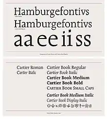 Cartier is a family of serif old style typefaces designed in 1967 by Carl Dair, who was commissioned by the Governor General of Canada-in-Council to create a new and distinctively Canadian typeface. The first proof of Cartier (in Roman and Italic faces) was published as "the first Canadian type for text composition" to mark the centenary of Canadian Confederation.[1]