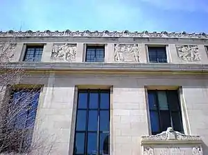 Carvings (Indiana State Library), is a series of bas-relief limestone panels decorating the facade of the Indiana State Library in Indianapolis, Indiana, United States. The reliefs were designed by artist Léon Hermant and carved by German sculptor Adolph Wolter in 1934. The panels on the east facade are approximately 80 by 80 by 5 inches (2,030 mm × 2,030 mm × 130 mm), the low panels on the east facade are approximately 18 by 18 by 1+1⁄2 inches (457 mm × 457 mm × 38 mm) inches, and the classical figures are each approximately 3 by 2 by 1⁄4 foot (0.914 m × 0.610 m × 0.076 m) . The library building was dedicated December 7, 1934.[1]