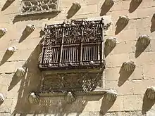It was built from 1493 to 1517 by Rodrigo Arias de Maldonado, a knight of the Order of Santiago de Compostela and a professor in the University of Salamanca. Its most peculiar feature is the façade, mixing late Gothic and Plateresque style, decorated with more than 300 shells, symbol of the order of Santiago, as well as of the pilgrims performing the Way of St. James. In the façade are also the coat of arms of the Catholic Monarchs and four windows in Gothic style, each one having a different shape. The entrance portal has the coat of arms of the Maldonado family, while in the architrave are dolphins, a Renaissance symbol of love, and vegetable elements.