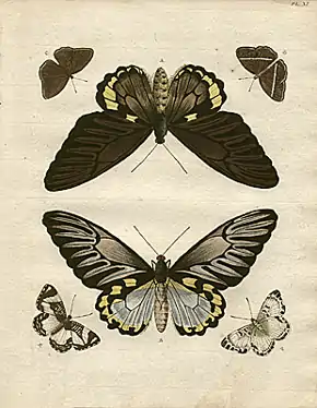 Stoll became involved with Pieter Cramer's De Uitlandsche Kapellen before 1774.[8] He took over the entire work after the death of Cramer, on 26 September 1776.[9] The first four volumes were finished in 1782 but Stoll kept working, at a much slower pace, caused by the lack of new material as he himself explained,[9] on the supplement (Aanhangsel), which was finally finished in 1791. Stoll mentioned that all the butterflies were collected in the Dutch colonies, like Surinam, Ceylon, Java, Ambon and Sierra Leone. The work was completed "without losing sight of the all-powerful hand of the Creator". In the 18th century, this was a sort of automatism, to safeguard a book from being banned or burned.[10]
