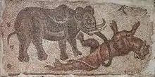 Mosaic of an elephant attacking a tiger, from Roman Syria, which occupied parts of what is now Anatolia and Mesopotamia[37]