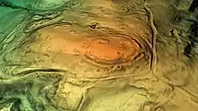 It is located on a hilltop overlooking the valley system of the River Calder and its tributaries, on the western edge of the South Pennines. On the upper part of the hill, triple rubble ramparts up to 1.5 metres (4 ft 11 in) high, separated by ditches of similar depth, surround the site on all sides except the north. On this side the defences consist mainly of a single rampart and ditch, but some short lengths of triple rampart and ditch are also found here. The inner rampart may have been timber-laced and revetted with stone and enclosed an oval area measuring approximately 115 by 76 metres (377 by 249 ft).[1]