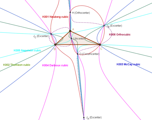 The Catalogue of Triangle Cubics is an online resource containing detailed information about more than 1200 cubic curves in the plane of a reference triangle.[1] The resource is maintained by Bernard Gilbert. Each cubic in the resource is assigned a unique identification number of the form "Knnn" where "nnn" denotes three digits. The identification number of the first entry in the catalogue is "K001" which is the Neuberg cubic of the reference triangle ABC. The catalogue provides, among other things, the following information about each of the cubics listed: