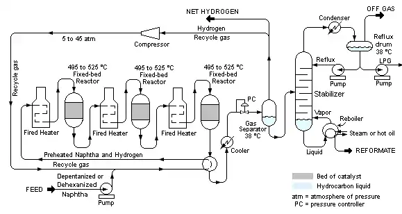 The liquid feed (at the bottom left in the diagram) is pumped up to the reaction pressure (5–45 atm) and is joined by a stream of hydrogen-rich recycle gas. The resulting liquid–gas mixture is preheated by flowing through a heat exchanger. The preheated feed mixture is then totally vaporized and heated to the reaction temperature (495–520 °C) before the vaporized reactants enter the first reactor. As the vaporized reactants flow through the fixed bed of catalyst in the reactor, the major reaction is the dehydrogenation of naphthenes to aromatics (as described earlier herein) which is highly endothermic and results in a large temperature decrease between the inlet and outlet of the reactor. To maintain the required reaction temperature and the rate of reaction, the vaporized stream is reheated in the second fired heater before it flows through the second reactor. The temperature again decreases across the second reactor and the vaporized stream must again be reheated in the third fired heater before it flows through the third reactor. As the vaporized stream proceeds through the three reactors, the reaction rates decrease and the reactors therefore become larger. At the same time, the amount of reheat required between the reactors becomes smaller. Usually, three reactors are all that is required to provide the desired performance of the catalytic reforming unit.