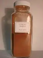 Catechu (/ˈkætɪʃuː/ or /ˈkætɪtʃuː/)[1] is an extract of acacia trees used variously as a food additive, astringent, tannin, and dye. It is extracted from several species of Acacia, but especially Senegalia catechu (Acacia catechu), by boiling the wood in water and evaporating the resulting brew.[2] It is also known as cutch, black cutch, cachou, cashoo, terra Japonica, or Japan earth, and also katha in Hindi, kaath in Marathi, khaira in Odia, khoyer in Assamese and Bengali, and kachu in Malay (hence the Latinized[3] Acacia catechu chosen as the Linnaean taxonomy name of the type-species Acacia plant which provides the extract).