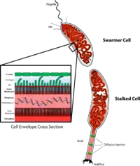 C. crescentus derives its name from its crescent shape, which is caused by the protein crescentin. It is an interesting organism to study because it inhabits nutrient-poor aquatic environments. Their ability to thrive in low levels of nutrients is facilitated by its dimorphic developmental cycle. The swarmer cell has a flagellum that protrudes from a single pole and is unable to initiate DNA replication unless differentiated into a stalked cell. The differentiation process includes a morphological transition characterized by ejection of its flagellum and growth of a stalk at the same pole. Stalked cells can elongate and replicate their DNA while growing a flagellum at the opposite pole, giving rise to a pre-divisional cell. Although the precise function of stalks is still being investigated, it is likely that the stalks are involved in the uptake of nutrients in nutrient-limited conditions.[2] Its use as a model originated with developmental biologist Lucy Shapiro.[3][4]