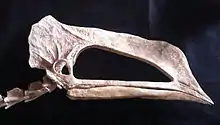 The skull is crowned by a large rounded crest that continues to behind, descending over the parietals. The crest is very thin, about half a millimetre at the upper part. The jaws are toothless. The profile of the symphysis of the lower jaws closely fits the edge of the upper jaws: when closing the beak, no gap would have remained. The symphysis has a low keel at the underside.[1]