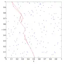 A plot of geodesics between two points in a 180-point causal set made by sprinkling into 1+1 dimensions