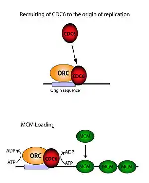 Cdc6, or cell division cycle 6, is a protein in eukaryotic cells. It is mainly studied in the budding yeast Saccharomyces cerevisiae (P09119). It is an essential regulator of DNA replication and plays important roles in the activation and maintenance of the checkpoint mechanisms in the cell cycle that coordinate S phase and mitosis. It is part of the pre-replicative complex (pre-RC) and is required for loading minichromosome maintenance (MCM) proteins onto the DNA, an essential step in the initiation of DNA synthesis. In addition, it is a member of the family of AAA+ ATPases and highly related to ORC1; both are the same protein in archaea.[2]