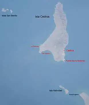 Cedros Island is located in Ensenada Municipality, off the west coast of the Mexican state of Baja California, from which it is separated by 100-kilometre-wide (62 mi) Sebastián Vizcaíno Bay. It is 22 km (14 mi) northwest of Punta Eugenia in Mulegé Municipality - the westernmost point of the state of Baja California Sur mainland. It also lies 15 km (9.32 mi) north of Isla Natividad (off Punta Eugenia, and also part of Mulegé Municipality) from which it is separated by the Canal de Keller, and some 500 km (311 mi) from San Diego.[2] The island has an area of 348.295 square kilometres (134.477 sq mi), being the fourth-largest island in Mexico (following Tiburón Island, Isla Ángel de la Guarda, and Cozumel). It has a maximum length of approximately 38 km (24 mi), and a maximum width of about 17 km (11 mi).[3]