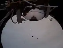 The alidade is mounted on a post at a height of 5 ft (1.5 m) from the ground. It consists of an arm with a pointer and open sight at one end and a rubber eyepiece at the other. The arm is mounted onto a curved scale that is marked both in meters and the coded cloud height (feet). The observer looks through the eyepiece and sets the sight onto the spot projected on the cloud and reads the height from the attached scale.