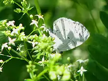Celastrina serotina, the cherry gall azure, is a butterfly of the family Lycaenidae. It is found across North America as far north as the treeline. Its flight time is between mid-May and mid-June in eastern Ontario after the spring azure and before the summer azure.[2] The larva has been reported to feed on galls of eriophyid mites (e. g. Eriophyes cerasicrumena) and apparently also on the mites themselves, making them one of the rare species of carnivorous Lepidoptera.[3] It is commonly found around woodland roads of upland mixed deciduous hardwood forests which are surrounded by wetlands.[4]