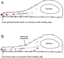 The leading edge at the front of a migrating cell is also the site at which membrane from internal membrane pools is returned to the cell surface at the end of the endocytic cycle.[16] [17] This suggests that extension of the leading edge occurs primarily by addition of membrane at the front of the cell. If so, the actin filaments that form there might stabilize the added membrane so that a structured extension, or lamella, is formed — rather than a bubble-like structure (or bleb) at its front.[18] For a cell to move, it is necessary to bring a fresh supply of "feet" (proteins called integrins, which attach a cell to the surface on which it is crawling) to the front. It is likely that these feet are endocytosed [19] toward the rear of the cell and brought to the cell's front by exocytosis, to be reused to form new attachments to the substrate.