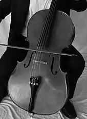The cello is played while seated. Its weight is supported mainly by its endpin, or spike, which rests on the floor.[1] The cello is steadied on the lower bout between the knees of the seated player, and on the upper bout against the upper chest. The neck of the cello is positioned above the player's left shoulder, while the C-String tuning peg is positioned just behind the left ear. The bow is drawn horizontally across the strings. In early times, female cellists sometimes played side-saddle, since it was considered improper for a lady to part her knees in public.[2] A player's handedness does not alter the way the cello is held or used. In rare cases, a player has used a mirror-image posture—usually because of a physical disability of the arm or hand that makes the required technique impossible for that side of the body. In such a situation, the player must decide whether or not to reverse the set-up of the cello (the string positions, bass-bar, sound post, fingerboard shape, and bridge carving are all asymmetrical).