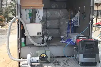 Spray-applied cellulose is used for applying cellulose to new wall construction. The differences are the addition of water to the cellulose while spraying as well as adding some kind of moisture retardant such as chlorine to prevent mold cultures. In some cases the insulation might also mix in a very small percentage of adhesive or activate a dry adhesive present in the cellulose. Wet-spray allows application without the need for a temporary retainer. In addition, wet-spray allows for an even better seal of the insulated cavity against air infiltration and eliminates settling problems. Wet-spray installation requires that the wall be allowed to dry for a minimum of 24 hours (or until maximum of 25% moisture is reached) before being covered.[5]