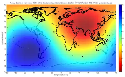 It is important to use a method that does not depend on a two-dimensional projection when dealing with the entire world. In a study from the Institut national d'études démographiques,[4] the solution methodology deals only with the globe. As a result, the answer is independent of which map projection is used or where it is centered. As described above, the exact location of the center of population will depend on both the granularity of the population data used, and the distance metric. With geodesic distances as the metric, and a granularity of 1,000 kilometers (600 mi), meaning that two population centers within 1000 km of each other are treated as part of a larger common population center of intermediate location, the world's center of population is found to lie where South Asia meets Central Asia[5] with an average distance of 5,200 kilometers (3,200 mi) to all humans.[4] The data used in the reference support this result to a precision of only a few hundred kilometers, hence the exact location is not known. Another analysis utilising city level population data found that the world's center of population is located close to Almaty, Kazakhstan.[6]