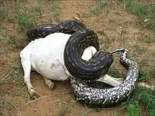 Like all pythons, the Central African rock python is non-venomous and kills by constriction.[21][23] After gripping the prey, the snake coils around it, tightening its coils every time the victim breathes out. Death is thought to be caused by cardiac arrest rather than by asphyxiation or crushing.[21] The African rock python feeds on a variety of large rodents, monkeys, warthogs, antelopes, vultures, fruit bats, monitor lizards, crocodiles, and more in forest areas,[8] and on rats, poultry, dogs, and goats in suburban areas. It will sometimes take fish as well.[33] Occasionally, it may eat the cubs of big cats such as leopards, lions, and cheetahs, cubs of hyenas, and puppies of wild dogs such as jackals and Cape hunting dogs.. However, these encounters are very rare, as the adult cats can easily kill pythons or fend them off.[34][11] On March 1, 2017, a 3.9-m (12-ft 10-in) African rock python was filmed eating a large adult male spotted hyena weighing 70 kg (150 lb). This encounter suggests that the snake might very well be capable of hunting and killing larger and more dangerous animals than previously thought.[35] The largest ever recorded meal of any snake was when a 4.9m African Rock Python consumed a 59-kg impala.[36]