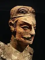 The art of Khalchayan of the end of the 2nd–1st century BC is probably one of the first known manifestations of Kushan art.[54] It is ultimately derived from Hellenistic art, and possibly from the art of the cities of Ai-Khanoum and Nysa.[54] At Khalchayan, rows of in-the-round terracotta statues showed Kushan princes in dignified attitudes, while some of the sculptural scenes are thought to depict the Kushans fighting against the Sakas.[55] The Yuezis are shown with a majestic demeanour, whereas the Sakas are typically represented with side-wiskers, displaying expressive and sometimes grotesque features.[55]