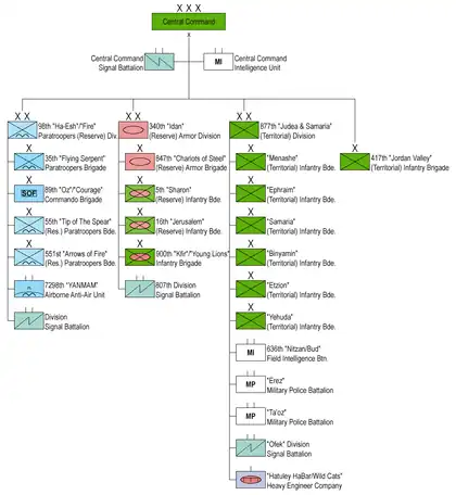 The Central Command (Hebrew: פיקוד מרכז, Pikud Merkaz), often abbreviated to Pakmaz (פקמ"ז), is a regional command of the Israel Defense Forces. It is responsible for the units and brigades located in the West Bank (under the West Bank Division), Jerusalem, the Sharon, Gush Dan, and the Shephelah.