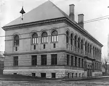 The Library Association of Portland was formed in 1864.[4] After going through several locations during the first half-century of existence, the library board decided on a new large main branch for downtown Portland in 1911.[5] The building was designed by architect A. E. Doyle, and opened on September 6, 1913.[6] It was one of the first libraries in the United States to feature an open plan design of the interior.[7] Construction on the building lasted for two years and cost $480,000 to complete.[6] Librarian Mary Frances Isom provided input on the design.[8]