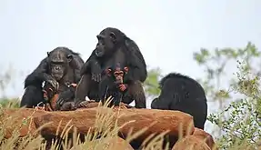 Central chimpanzees are opportunistic frugivores, compared to western lowland gorillas and Bornean orangutans that are generalized frugivores, central chimpanzees are specialised frugivores. Central chimpanzees diet consists mainly of fruits in their diets. During months were the fruit availability is low, central chimpanzees are able to keep a high fruit intake. The central chimpanzees tend to stay in the vegetation to get their food source. In a study it mentions that central chimpanzees and western lowland gorillas high fruit consumption overlap in many parts of Central Africa. But in most cases central chimpanzees consumed more fruits in their diets (60%), where western lowland gorillas also consumed more leaves. This is due to their digestive specificities. So they do not seem to have a direct competition for food between central chimpanzees and western lowland gorillas.[9] It was also seen that central chimpanzees in the Montane forest of Kahuzi swallowed two different types of leaves of Commelinaceae for medical purposes. This was seen in 2.1% of the fecal matter of the central chimpanzees. It was proposed that this was done to control intestinal parasites.[10] They are known to be occasional predators, which is the red colobus monkey. Although this is a rare occurrence this does occur in Central Africa. The population being in decline the occurrence of Central Africa is diminishing.[11]