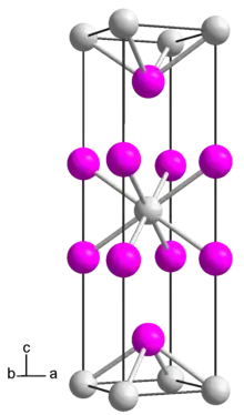Cerium diiodide is an opaque dark solid with a metal-like appearance and properties. There is no cerium(II) in cerium diiodide, and its real structure is Ce3+(I−)2e−. It is easily hydrolyzed to form the corresponding iodide oxide.[2] Like lanthanum diiodide and praseodymium diiodide, the cerium diiodide forms in the MoSi2-type structure,[4] with space group I4/mmm (No. 139).[5]