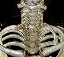 A cervical rib in humans is an extra rib which arises from the seventh cervical vertebra. Their presence is a congenital abnormality located above the normal first rib. A cervical rib is estimated to occur in 0.2%[2] to 0.5%[3] (1 in 200 to 500) of the population.[4] People may have a cervical rib on the right, left or both sides.[5]