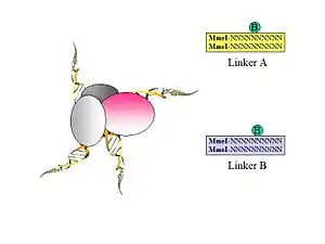- Figure 1. Biotinylated oligonucleotide half-linkers containing flanking MmeI sites are used to connect proximity ligated DNA fragments. Two different linkers are designed (A and B) with specific nucleotide barcodes (CG or AT) for each of the two linker sequences (this will allow the identification of the chimeric ligation product as described in Figure 5.).