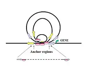 The interactions form DNA loop structures with multiple TFBS at the anchoring center. Small loops might package genes near the anchoring center in a tight sub-compartment, which could increase the local concentration of regulatory proteins for enhanced transcriptional activation. This mechanism might also enhance transcription efficiency, allowing RNA pol II to cycle the tight circular gene templates. The large interaction loops are more likely to link together distant genes at either end of the loop residing near anchor sites for coordinated regulation, or could separate genes in long loops to prevent their activation. Adapted from Fullwood et al. (2009).