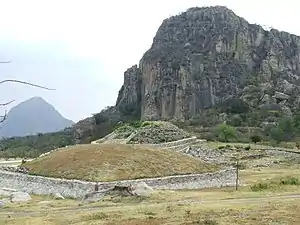 Chalcatzingo is a Mesoamerican archaeological site in the Valley of Morelos (municipality of Jantetelco) dating from the Formative Period of Mesoamerican chronology. The site is well known for its extensive array of Olmec-style monumental art and iconography. Located in the southern portion of the Central Highlands of Mexico, Chalcatzingo is estimated to have been settled as early as 1500 BCE. The inhabitants began to produce and display Olmec-style art and architecture around 900 BCE.[1] At its height between 700 BCE and 500 BCE, Chalcatzingo's population is estimated at between five hundred and a thousand people. By 500 BCE it had gone into decline. The climate in Morelos is generally warmer and more humid than the rest of the Highlands. The Chalcatzingo center covers roughly 100 acres (0.40 km2). Evidence indicates that this was a site of ritual significance.[2]