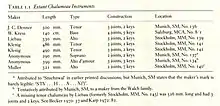 About ten original chalumeaux are extant, but modern craftsmen produce replicas based on these original instruments. Of the original instruments, most are made of boxwood and all feature two keys placed opposite each other to be played by the thumb and first finger of the left hand. The mouthpieces of these instruments usually have the reed placed on top so that it vibrates against the upper lip when played.[4] The surviving chalumeaux were made between the beginning of the eighteenth century and about 1760 by five known instrument makers including J.C. Denner, W. Kress, Liebau, Klenig, and Muller.[4] Of these instruments, there is one soprano and one bass chalumeau, several tenor and alto chalumeaux, and one rare chalumeau d’amour. The chalumeau d’amour has a bulbous bell like its rare contemporary the clarinette d’amour and the modern-day English horn.[3]