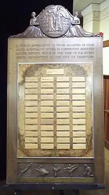 A wood plaque was also presented to the city by the White House on July 16, 8:00 pm in Traverse City during the 1936 Cherry Festival.[15][16] The plaque bears the signatures of President Franklin D. Roosevelt as well as the Governors of all the states in the union (48 at the time). The plaque bears the inscription: "A nation appreciative of those qualities of character essential to success in competitive athletics salutes Detroit, which in this year of 1936 richly merits recognition as the City of Champions." The presentation was broadcast over a national radio chain.[17] The inscription was authored by Harold Titus.[18]