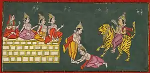 ![]() The siblings Muktabai, Sopan, Dnyaneshwar and Nivruttinath seated on the moving wall, Changdev seated on a tiger. In the centre, Changdev bows to Dnyaneshwar | |