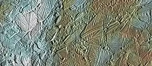 In astrogeology, chaos terrain, or chaotic terrain, is a planetary surface area where features such as ridges, cracks, and plains appear jumbled and enmeshed with one another. Chaos terrain is a notable feature of the planets Mars and Mercury, Jupiter's moon Europa, and the dwarf planet Pluto. In scientific nomenclature, "chaos" is used as a component of proper nouns (e.g., "Aureum Chaos" on Mars).[1]