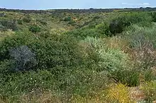 The perspective that older chaparral is unhealthy or unproductive may have originated during the 1940s when studies were conducted measuring the amount of forage available to deer populations in chaparral stands.[18] However, according to recent studies, California chaparral is extraordinarily resilient to very long periods without fire[19] and continues to maintain productive growth throughout pre-fire conditions.[20][21] Seeds of many chaparral plants actually require 30 years or more worth of accumulated leaf litter before they will successfully germinate (e.g., scrub oak, Quercus berberidifolia; toyon, Heteromeles arbutifolia; and holly-leafed cherry, Prunus ilicifolia). When intervals between fires drop below 10 to 15 years, many chaparral species are eliminated and the system is typically replaced by non-native, invasive, weedy grassland.[22][23][24]