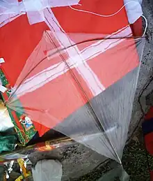 Chapi-chapi is a small two-stick kite that can be quickly constructed from cheap materials such as newspapers, broom sticks, or discarded plastic sheet. It is very popular in the Philippines. The name itself colloquially means, "assembled fast" or "quickly improvised".[1] A strong, straight stick is used for the vertical frame. The horizontal stick is tensioned into a bow in order to provide greater support for the paper or plastic sheet. A very long bottom tail is almost always necessary, while the side tails or fins are optional.
