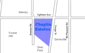 Chaplin Estates is a neighbourhood that covers the southwest portion of the Yonge and Eglinton area in Toronto, Ontario, Canada. It lies west of Yonge Street and is bounded by Eglinton Avenue to the north and Avenue Road to the west. The southern boundary is Chaplin Crescent, which runs parallel to the former Beltline Railway line, now the Beltline Trail, a scenic walking and biking trail.