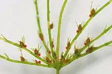 | Chara virgata. Note the typical reproductive organs: male antheridia (red) and female archegonia (brown). | |