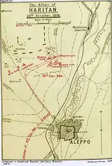 On 21 October the 15th (Imperial Service) Cavalry Brigade were issued orders to continue the advance to Aleppo. The brigade was preceded by seven light armoured cars, but the remainder of the division was following a day behind. On 24 October the armoured cars advance was stopped by Turkish defences near Khan Tuman. The Turks held a strong defensive line, on a ridge line to the south and west of Aleppo. The brigade was ordered to occupy a position on the Aleppo-Alexandretta road and to clear Turkish trenches on the ridge to the west of Aleppo. However, when they reached the ridge line on 26 October the position had been evacuated.[20] Intelligence from locals suggested that a force of one thousand men with two small artillery guns were heading north out of Aleppo, so the brigade set off in pursuit. At 11:00 the leading two Jodhpur Lancers squadron and a machine-gun section reached a position overlooking Haritan to the north of Aleppo, when they came under Turkish small arms fire. Brigadier Harbord in command ordered an immediate brigade attack, the Mysore Lancers would move around to the east of the ridge and charge the village followed up by the other two Jodhpur Lancer squadrons. While the remainder of the Brigade Machine-Gun Squadron would move onto the ridge to provide covering fire, with the two other Jodhpur squadrons. The armoured cars of No. 12 Light Armoured Motor Battery arrived at 11:30 and were ordered along the main road to support the attack. As the attack started the leading armoured car developed a fault and returned to their start position, a misunderstanding resulted in the rest of the battery following them, taking them out of the attack. The Mysore Lancers had also started their advance but discovered the Turkish line was longer than expected and had to move further east, out of range of their supporting machine-guns, to get into a position to charge. At 12:00 the lancers charged the Turkish position, killing fifty men and capturing another twenty prisoners. But without any fire support from their machine-gun squadron they were unable to penetrate into the Turkish defences and were forced to withdraw to the rear, dismount and keep the Turkish position under observation.[21] The extent of which had not until then been fully appreciated and was now estimated to be held by a force of three thousand infantry, four hundred cavalry, up to twelve artillery guns and between thirty and forty machine-guns. One group of Turkish soldiers started towards the Mysore Lancers position, but halted about eight hundred yards (730 m) short and started to dig new defensive trenches. Unable to progress against the larger force the brigade kept the position under observation and at 21:00 the Turks were observed to be withdrawing and had completely evacuated their positions by midnight. Just prior to that at 23:15 the 14th Cavalry Brigade arrived, setting up their own observation lines, until daylight when they took over the 15th Brigades positions. In the days battle Turkish casualties were estimated to be around 100 men, while the brigade had four British officers killed including Lieutenant-Colonel Holden, the senior Special Service Officer, attached to the Jodhpur Lancers, one Indian Officer and sixteen other ranks were also killed. Twelve officers, six of them British, and forty-four other ranks were wounded, another three other ranks were reported missing.[22][23] That night the Turkish forces withdrew twenty miles (32 km) to Deir el Jemel to the north-west of Aleppo. The 5th Cavalry Division was not strong enough by itself to continue the advance and halted waiting for the Australian Mounted Division to catch up with them.[24] However the day after their unsuccessful charge, 27 October the brigade became the division reserve and was ordered back to Aleppo.[22][25]