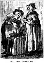 Dickens's biographer Claire Tomalin regards him as the greatest creator of character in English fiction after Shakespeare.[179] Dickensian characters are amongst the most memorable in English literature, especially so because of their typically whimsical names. The likes of Ebenezer Scrooge, Tiny Tim, Jacob Marley and Bob Cratchit (A Christmas Carol); Oliver Twist, The Artful Dodger, Fagin and Bill Sikes (Oliver Twist); Pip, Miss Havisham and Abel Magwitch (Great Expectations); Sydney Carton, Charles Darnay and Madame Defarge (A Tale of Two Cities); David Copperfield, Uriah Heep and Mr Micawber (David Copperfield); Daniel Quilp and Nell Trent (The Old Curiosity Shop), Samuel Pickwick and Sam Weller (The Pickwick Papers); and Wackford Squeers (Nicholas Nickleby) are so well known as to be part and parcel of popular culture, and in some cases have passed into ordinary language: a scrooge, for example, is a miser or someone who dislikes Christmas festivity.[180]