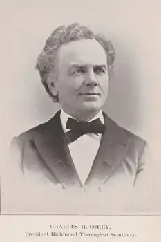 In 1867, a Richmond campus of the National Theological Institute was established by Dr. Nathaniel Colver of the American Baptist Home Mission Society.[4] Colver died shortly thereafter, and the newly renamed Colver Institute was taken over by Corey. The school was renamed again as the Richmond Theological Seminary (also called Institute) which Charles Corey headed for 30 years.[5] In the 1890s, Corey was instrumental in the merging of the Richmond Theological Seminary with the Wayland Seminary to form Virginia Union University. In 1895, Corey wrote a history of the school. He retired in 1898.[5] The L. Douglas Wilder Library and Learning Resource Center holds the records of the Richmond Theological Seminary which includes Corey's personal and business correspondence.[4]