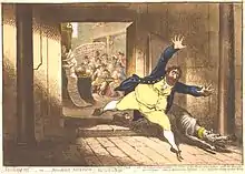 In Fox's own constituency of Westminster, the contest was particularly fierce. An energetic campaign in his favour was run by Georgiana, Duchess of Devonshire, allegedly a lover of Fox's who was said to have won at least one vote for him by kissing a shoemaker with a rather romantic idea of what constituted a bribe. In the end, Fox was re-elected by a very slender margin, but legal challenges (encouraged, to an extent, by Pitt and the King)[25] prevented a final declaration of the result for over a year. In the meantime, Fox sat for the Scottish pocket borough of Tain or Northern Burghs, for which he was qualified by being made an unlikely burgess of Kirkwall in Orkney (which was one of the Burghs in the district). The experience of these years was crucial in Fox's political formation. His suspicions had been confirmed; it seemed to him that George III had personally scuppered both the Rockingham-Shelburne and Fox-North governments, interfered in the legislative process and now dissolved Parliament when its composition inconvenienced him. Pitt – a man of little property and no party – seemed to Fox a blatant tool of the Crown.[26] However, the King and Pitt had great popular support, and many in the press and general population saw Fox as the trouble-maker challenging the composition of the constitution and the King's remaining powers. He was often caricatured as Oliver Cromwell and Guy Fawkes during this period, as well as Satan, "Carlo Khan" (see James Sayers) and Machiavelli.[27]