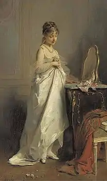 Gradually the muddy colours used by Chaplin transformed into white, grey and pink, depicting his models with an opalescent, mother-of-pearl complexion by applying a subtle palette of rosy flesh tones and light greys. After painting portraits and trying his skills on ornamental painting, Chaplin took up genre painting in the 1850s. His favourite subjects are the feminine grace of a young woman's everyday life. He portrays women in several poses: resting; grooming; singing; and reading. He captures them with lightness and carelessness and accentuates the decorative elements of the composition.[2]