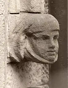 [Indoors] "the braces to the chancel roof are supported on winged angels holding shields, which are charged with the emblems of the Passion ... [Outside on the tower], facing the high road, is the principal entrance door, with the well-known four-leaved flowers carved in the hollow of the jambs and arch, the hood mould is finished with the heads of king and bishop; over the doorway is a canopied niche in which is placed the figure of St. Matthew ... Mr. Charles Mawer has executed the carving in a most creditable manner."[48] (Yorkshire Post and Leeds Intelligencer 22 September 1875)