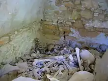 A charnel house is a vault or building where human skeletal remains are stored. They are often built near churches for depositing bones that are unearthed while digging graves. The term can also be used more generally as a description of a place filled with death and destruction.
