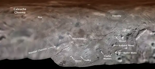 - International Astronomical Union. Pluto's largest moon, Charon, gets its first official feature names. Consulted 7 February 2023.