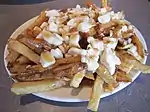 Cheese curds are moist pieces of curdled milk, eaten either alone or as a snack, or used in prepared dishes. They are most often consumed throughout the northern United States and Canada.[1] Notably, cheese curds are popular in Quebec, as part of the dish poutine (made of French fries topped with cheese curds and gravy), and in Wisconsin and Minnesota where they can be served breaded and deep fried. Curds are sometimes referred to as "squeaky cheese" or fromage en crottes (literally: "droppings of cheese").[2]