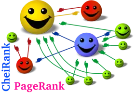 For a given directed network the Google matrix is constructed in the way described in the article Google matrix. The PageRank vector is the eigenvector with the maximal real eigenvalue . It was introduced in[1] and is discussed in the article PageRank. In a similar way the CheiRank is the eigenvector with the maximal real eigenvalue of the matrix built in the same way as but using inverted direction of links in the initially given adjacency matrix. Both matrices and belong to the class of Perron–Frobenius operators and according to the Perron–Frobenius theorem the CheiRank and PageRank eigenvectors have nonnegative components which can be interpreted as probabilities.[2][3] Thus all nodes of the network can be ordered in a decreasing probability order with ranks for CheiRank and PageRank respectively. In average the PageRank probability is proportional to the number of ingoing links with .[4][5][6] For the World Wide Web (WWW) network the exponent where is the exponent for ingoing links distribution.[4][5] In a similar way the CheiRank probability is in average proportional to the number of outgoing links with with where is the exponent for outgoing links distribution of the WWW.[4][5] The CheiRank was introduced for the procedure call network of Linux Kernel software in,[7] the term itself was used in Zhirov.[8] While the PageRank highlights very well known and popular nodes, the CheiRank highlights very communicative nodes. Top PageRank and CheiRank nodes have certain analogy to authorities and hubs appearing in the HITS algorithm[9] but the HITS is query dependent while the rank probabilities and classify all nodes of the network. Since each node belongs both to CheiRank and PageRank we obtain a two-dimensional ranking of network nodes. There had been early studies of PageRank in networks with inverted direction of links[10][11] but the properties of two-dimensional ranking had not been analyzed in detail.