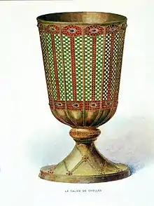 Until the French Revolution, when it disappeared, Chelles Abbey possessed a renowned Merovingian gold chalice, enameled and mounted with precious stones,[22] that was said to have been wrought by Saint Eligius and a very large number of relics.